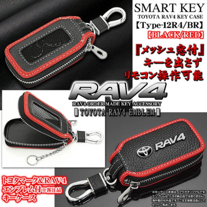 【タイプ12R4/BR】トヨタ/RAV4 キーケース/牛革製[ブラック/レッド]Tマーク&RAV4エンブレム付/キーホルダー/窓付...
