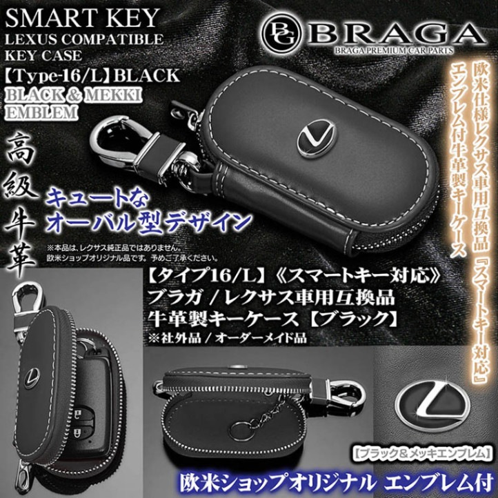 ブラガ/レクサス車用互換品キーケース【タイプ2L/BK】ブラック牛革レザー&メッキ/レクサス スマートキー対応/Lマークエンブレム...