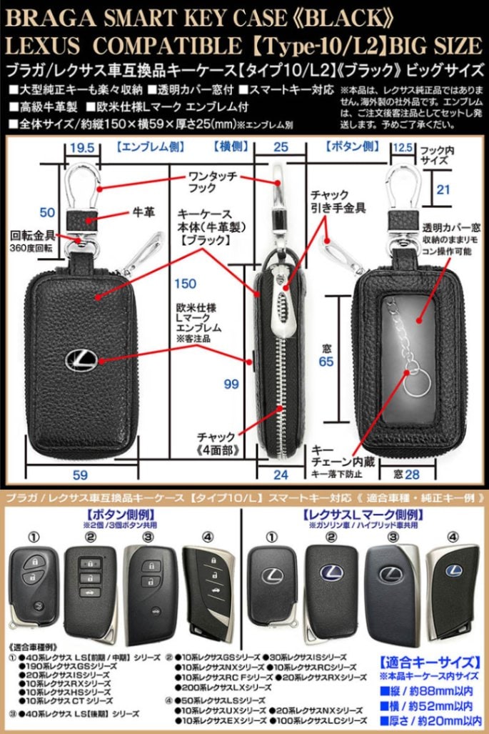 ブラガ/レクサス車互換品キーケース[ビッグLサイズ/ブラック]Lマーク エンブレム[タイプ10/L2]/透明カバー窓付/スマートキ...