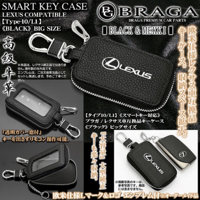 ブラガ/レクサス車互換品キーケース[ビッグLサイズ/ブラック]Lマーク&LEXUSロゴ エンブレム[タイプ10/L1]/透明カバー...