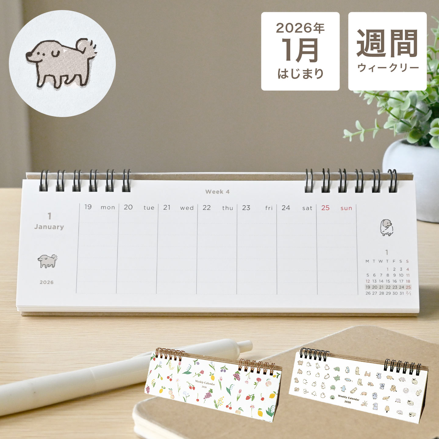 カレンダー 2026 卓上 ウィークリー 週めくり 週間 月曜始まり 1月始まり リング ミニ 小さい コンパクト スリム mat...