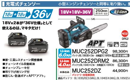 DIY女子も必見[税込新品]マキタ 36V充電式チェンソー MUC252DPG2 バッテリ・充電器付 チェーンソー【ポイント消化...