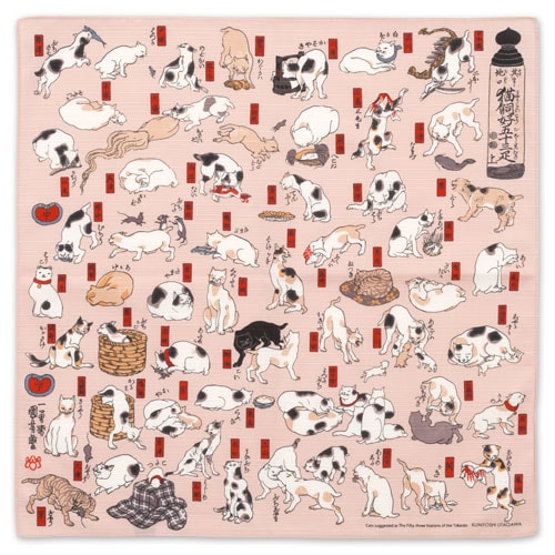 チーフ風呂敷 隅田川 猫飼好五十三疋(みゃうかいこうごじゅうさんびき) 48cm幅綿風呂敷 Cat Furoshiki Wrap...
