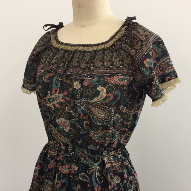 昭和レトロ 70年代 モダン柄 半袖ワンピース サイズ9 花柄 ペイズリー ティヤードスカート 送料無料 国内古着