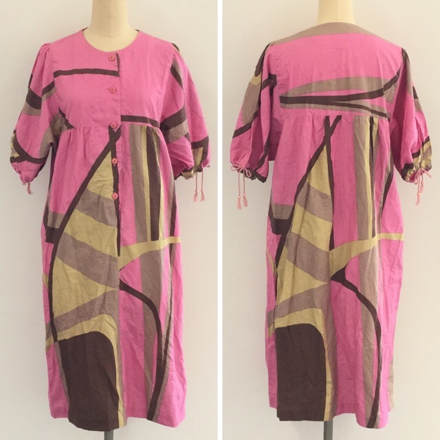 国内古着 昭和レトロ 半袖ワンピース レディース 11/ピンクx茶系 コットン シンプル カジュアル 古着卸 送料無料