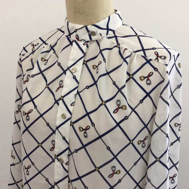 昭和レトロ モダン ビンテージ 長袖ブラウス サイズM程度 スタンドカラー ビッド ベルト チェーン 国内古着 送料無料