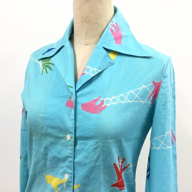 昭和レトロ モダン 長袖ブラウス サイズS/水色 オープンカラー あやとり カジュアル アート 国内古着 送料無料