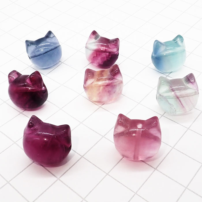 ネコ ビーズ (1個)【 フローライト 】縦穴 横穴 マルチフローライト 天然石 顔 猫 国内発送
