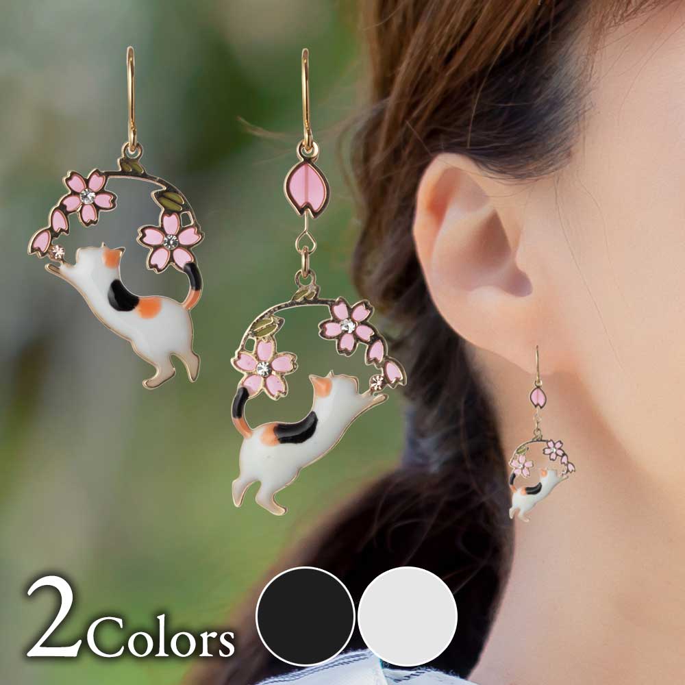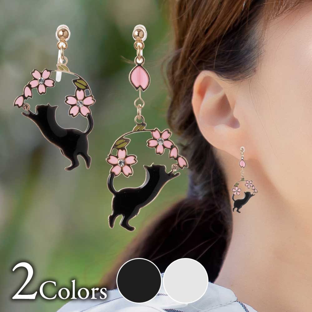 アクセソワール 桜日和と猫ひと休みイヤリング 桜ゆらり、耳元に春色のきらめき アレルギー反応の出にくい樹脂ノンホール チャーム24...
