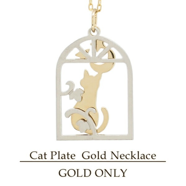 猫 ゴールドネックレス(チェーン付きペンダント) ねこ キャット 窓 ウィンドウ アイビー ツタ アラベスク 唐草 植物 プレート...