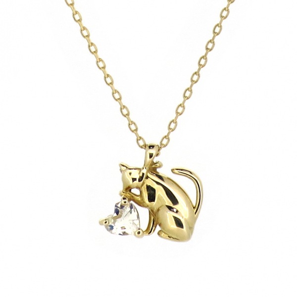 猫 ゴールドネックレス(チェーン付きペンダント) ねこ キャット ハート 粒 ストーン 10金 イエローゴールド ムーンストーン ...
