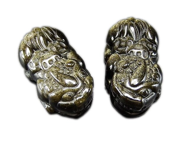 良質ゴールドオブシディアン天然石金銭3枚背負う中型ヒキュウ彫刻ペア置物