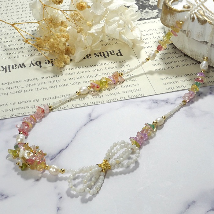 ストーン ネックレス リボン クラック水晶 レインボー シェル 淡水パール 約39cm SUS316 950274