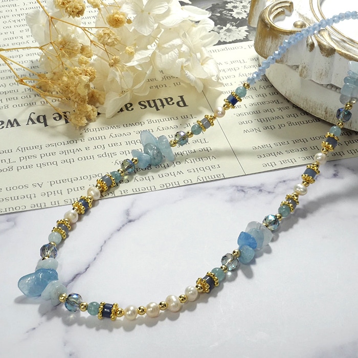 ストーン ネックレス アクアマリン ブルーアベンチュリン 淡水パール 約39cm SUS316 950219