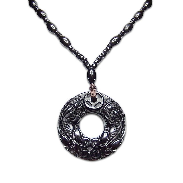 天然石ブラックオブシディアンヒキュウペア金銭彫刻平安扣ネックレスM11-02