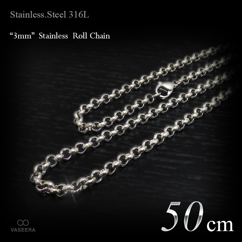 3mm幅 ステンレス ロール・チェーン(甲丸/真円あずき) 50cm 【ステンレススチール316L(SUS316L) /サージカル...