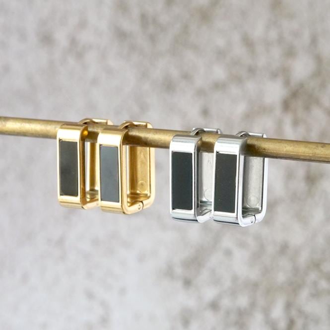 金属アレルギー対応 ステンレス ピアス 【171. レクタングル フープ ブラックストーン ピアス】 キャッチレス メール便送料無...