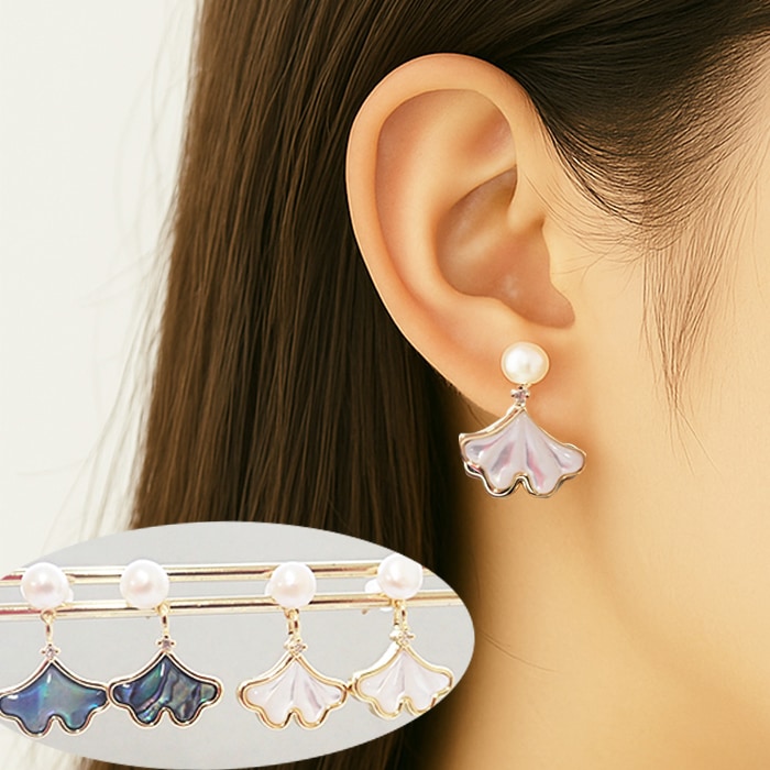 淡水パール&アバロンシェルピアス ゴールド枠 天然貝 樹葉デザイン 上品 個性的 レディース