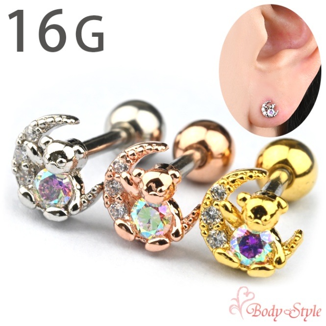 クマ 月 ベアー ムーン ピアス 16g ボディピアス サージカルステンレス 軟骨ピアス おしゃれピアス トラガス ヘリックス 金...