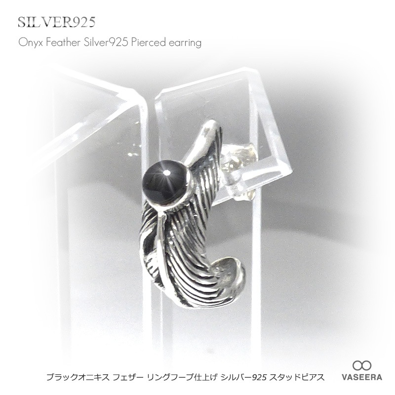 【単品販売(一個)】 ブラックオニキス埋め込み リングフープ風フェザー(羽根) シルバー925 スタッドピアス 【シルバーピアス...