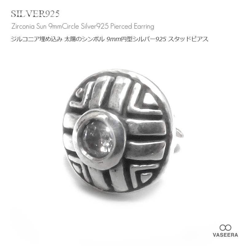 【単品販売(一個)】 ジルコニア埋め込み サン(太陽)シンボル 9mm円型 シルバー925 スタッドピアス 【シルバーピアス / ...