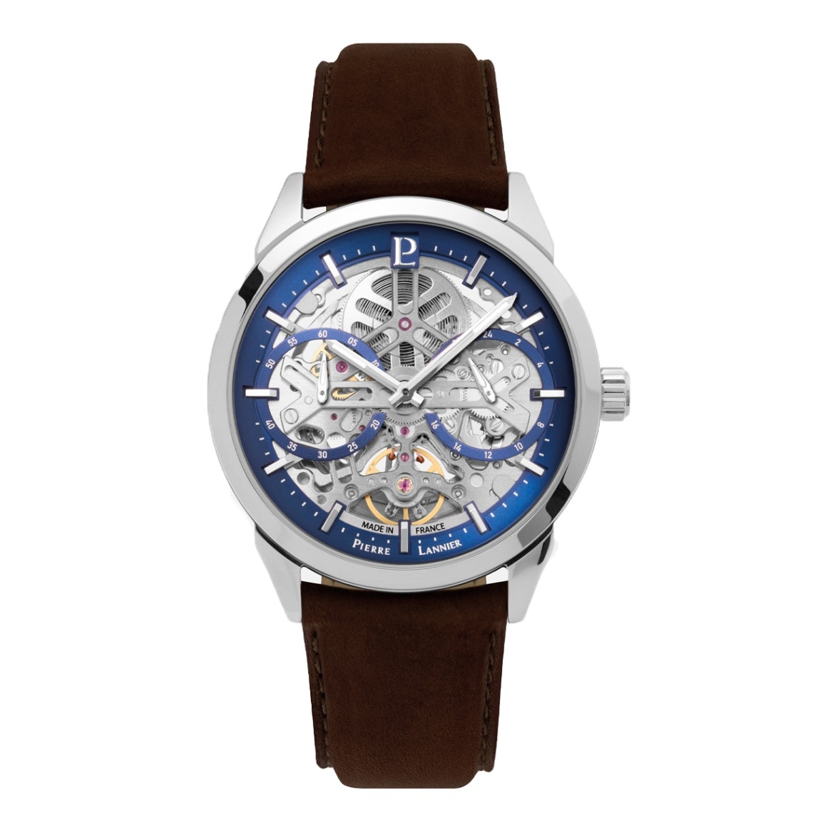 Monarck モナーク 自動巻き メンズ 腕時計 スケルトン 革ベルト シルバー 青文字盤 ブラウン