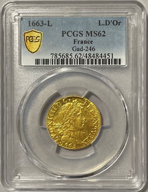 【レア度4-R4】フランス 1663-L年 ルイ14世 1ルイドール金貨 PCGS-MS62