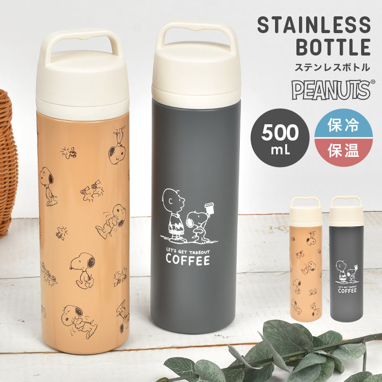 水筒 スヌーピー おしゃれ 女子 500ml 持ち手付き ステンレスボトル 保温 保冷 直飲み SNOOPY シンプル グレー 軽...