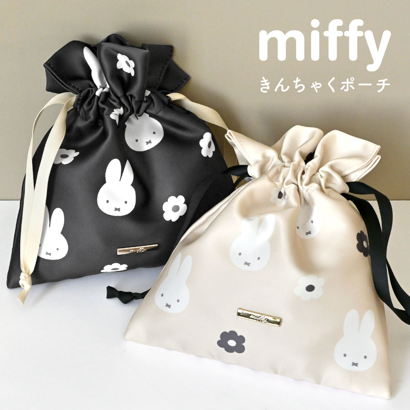 巾着ポーチ ミッフィー miffy サテン モノクロ 化粧ポーチ コスメポーチ 小物入れ ミニポーチ 巾着袋 巾着 バッグインバッ...