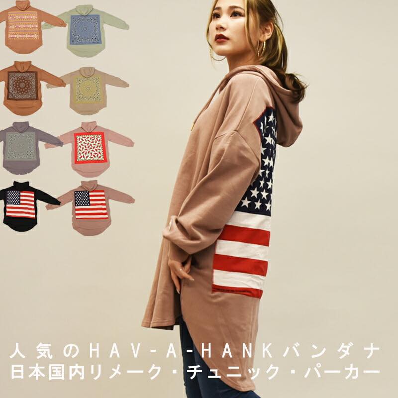 HAVAHANKバンダナ総刺繍ワッペン裏毛リメイク長袖チュニック丈裏毛パーカーコットン100%トップス TOPS レディース 綿1...