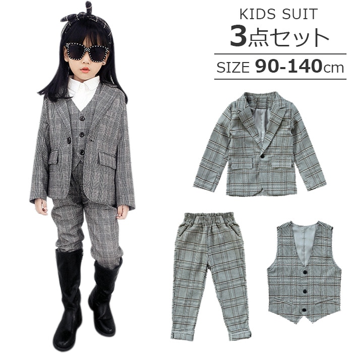 営業日は正午まで当日発送 送料無料 女の子 スーツ 3点セット ジャケット/ベスト/パンツ 3ピース スーツセット グレー チェッ...