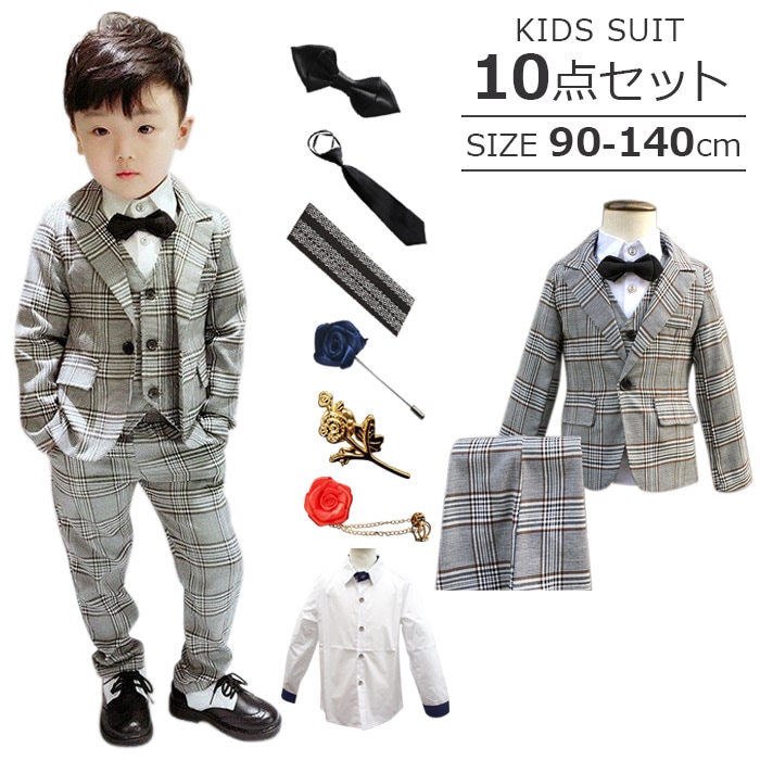 営業日は正午まで当日発送 送料無料 男の子 子供スーツ 10点セット 格子柄 フォーマルスーツ 子供スーツ ジャケット ベスト パ...