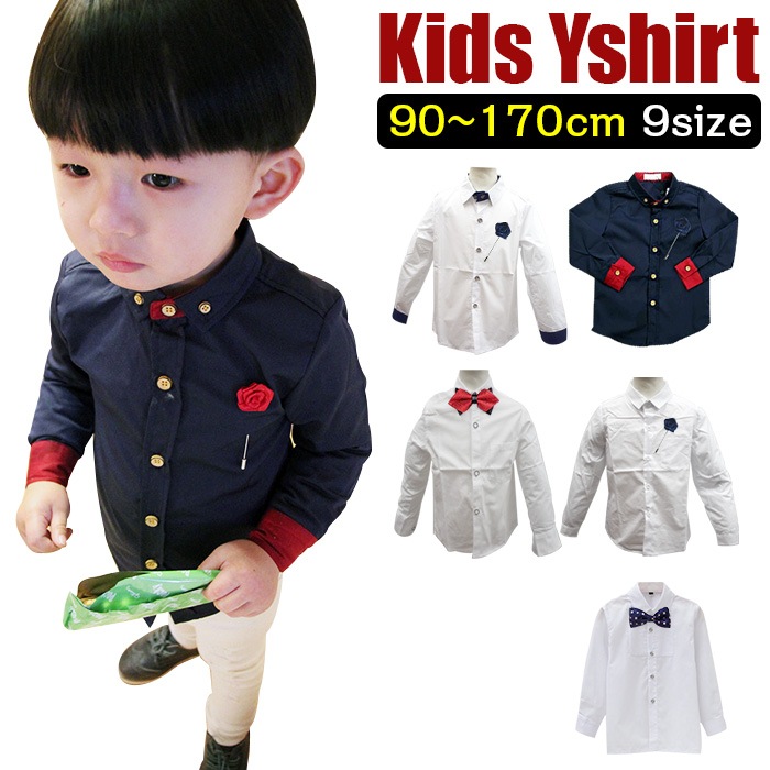 2点セット 男の子 ワイシャツ Yシャツ ホワイト ブルー 長袖シャツ フォーマル シャツ 子供 スーツ 薔薇ピン 蝶ネクタイ 男...