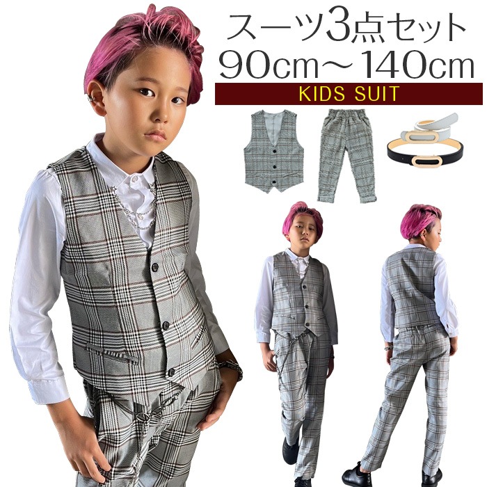 営業日は12時まで当日発送 男の子 子供スーツ 3点セット ベスト/パンツ/ベルト スーツセット グレー チェック柄 格子 カジュ...