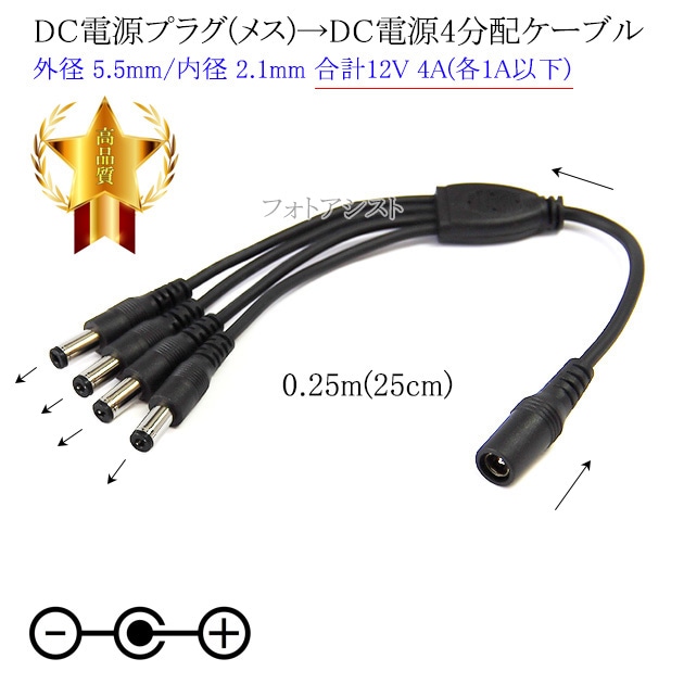 DC電源プラグ(メス)→DC電源プラグ (オス)4分配ケーブル 外径 5.5mm/内径 2.1mm 合計12V 4A(各1A以下)...