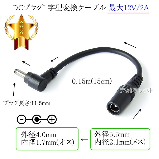DCプラグL字型変換ケーブル 外径5.5mm/内径2.1mm(メス)→外径4.0mm/内径1.7mm(オス) 最大12V/2A...
