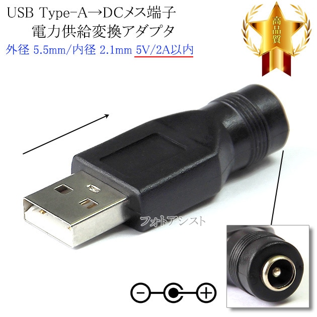 USB Type-A→DCメス端子 電力供給変換アダプタ 外径 5.5mm/内径 2.1mm 5V/2A以内