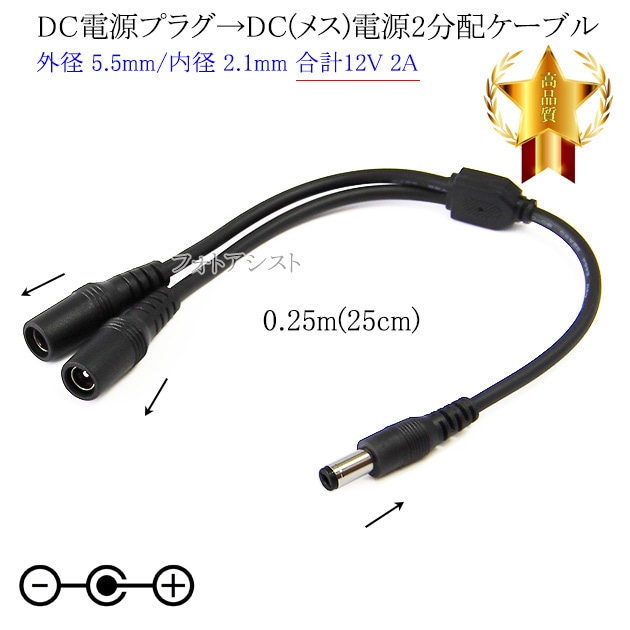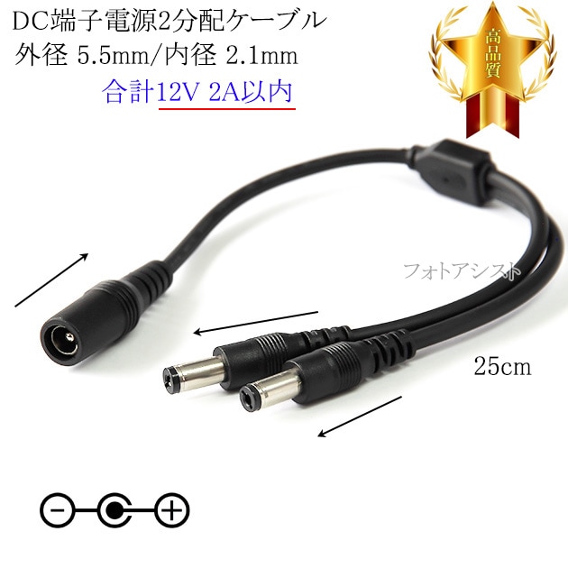 DC端子電源2分配ケーブル 外径 5.5mm/内径 2.1mm 合計12V 2A以内 長さ0.25m (25cm) ブラック