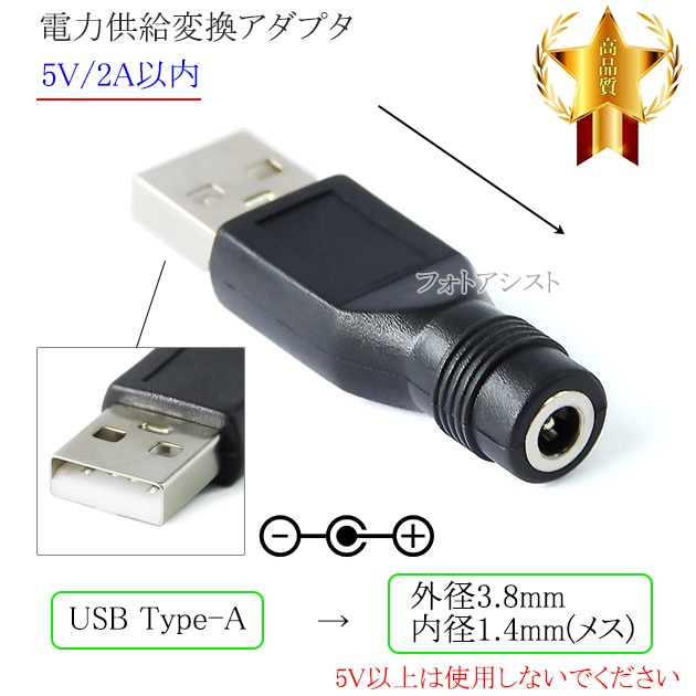 USB Type-A→DCメス端子 電力供給変換アダプタ 外径 3.8mm/内径 1.4mm 5V/2A以内