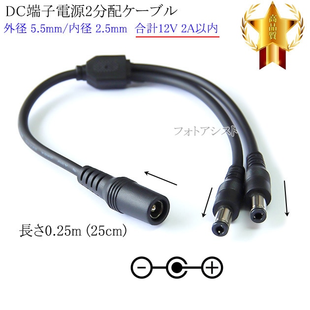 DC端子電源2分配ケーブル 外径 5.5mm/内径 2.5mm 合計12V 2A以内 長さ0.25m (25cm) ブラック