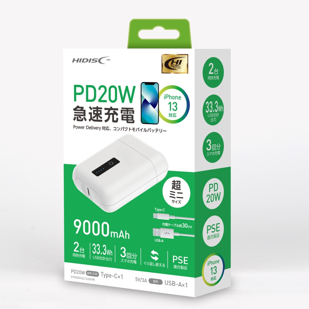 HIDISC PD20W対応超ミニ9000mAhモバイルバッテリー HD-LB1088BWH