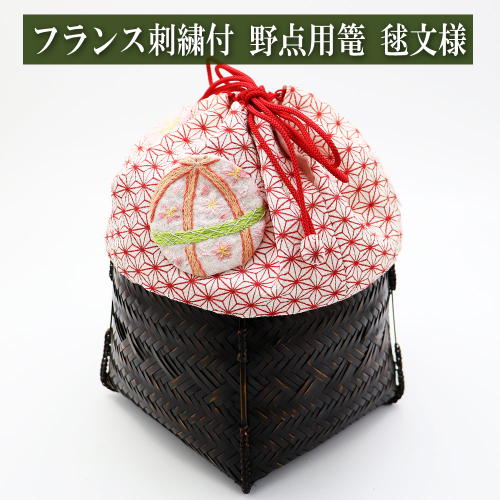 フランス刺繍仕服付竹篭 手毬刺繍 蝶々柄 野点用茶道具篭 和装ポーチ 茶道具 茶器 着物 浴衣 茶筅 茶碗 茶杓 茶巾 抹茶 炭道...