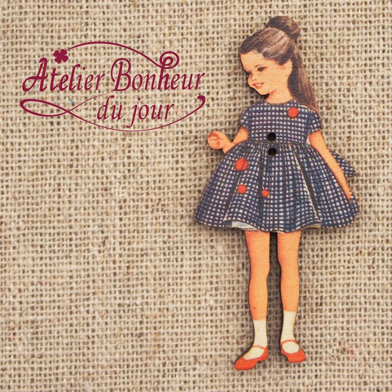 フランス製 木製ボタン 2つ穴 (青いギンガムの女の子) アトリエ・ボヌール・ドゥ・ジュール