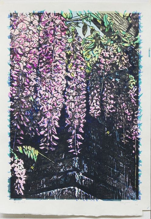 壬生川純一 木版画 藤波の花 ーJunichi Mibugawa Waves of Wisteria Blossomsー