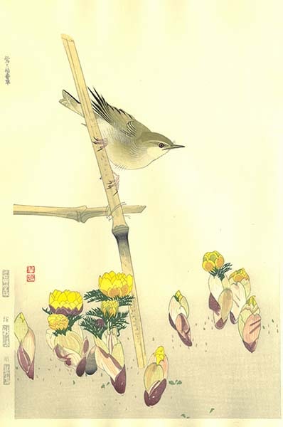 福田翠光木版画 鶯と福寿草 Suiko Fukuda Woodcutprint