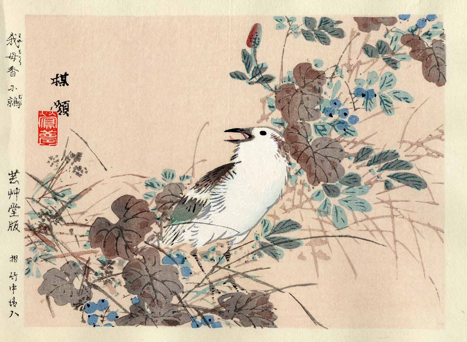 幸野楳嶺 木版画 まめどり Bairei Kono Woodcut Cuttlefish bird