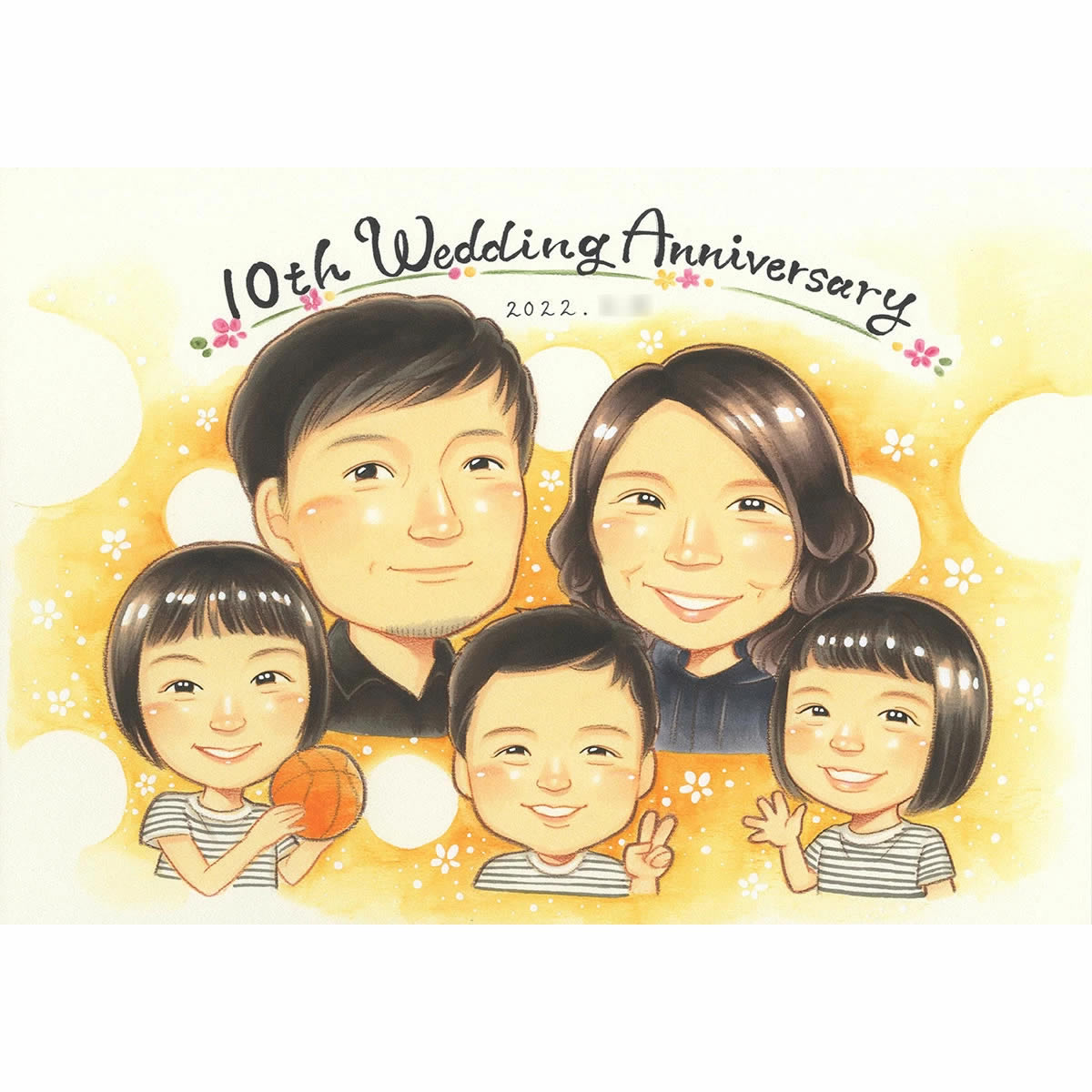 10周年の記念のファミリー似顔絵 お父さん お母さん 子供達 もちろんペットも一緒にお描きすることもできます!結婚記念日 家族 プ...