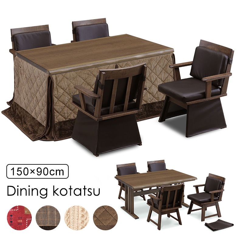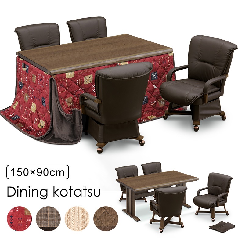 ダイニングこたつテーブル 6点セット 150×90cm 布団セット ハイタイプ 4人用 回転椅子 肘付き キャスター付き ブラウン...