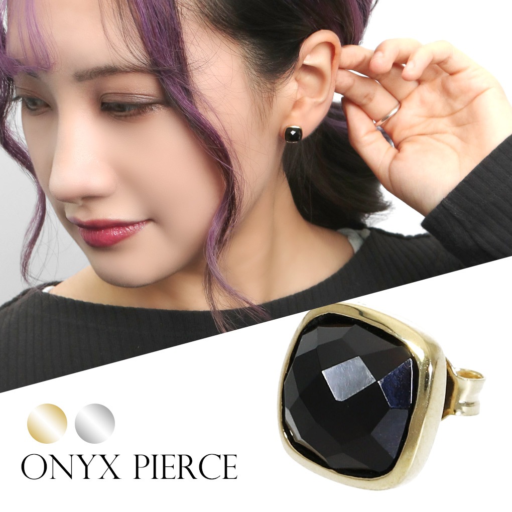 チェッカーカット オニキス スクエア 一粒ピアス 1P 片耳用 ピアス シルバー925 ゴールド シルバー 銀 黒 ブラック 天然...