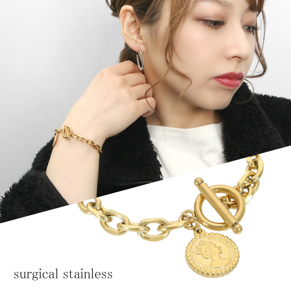 ステンレス ゴールド コイン マンテル ブレスレット サージカルステンレス 18金 K18 コーティング 金属アレルギーフリー ニ...
